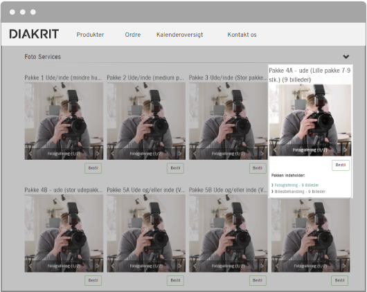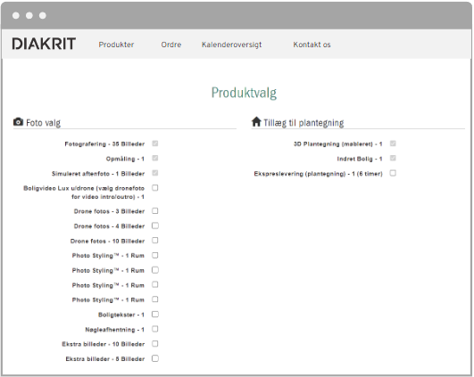 Under Produktvalg kan du tilføje ekstra foto- eller plantegningstjenester. Gråmarkerede tjenester er inkluderet i din valgte pakke uden ekstra omkostninger. Eventuelle valgte ekstratjenester vil medføre omkostninger, tydeligt angivet ved hvert tilvalgsprodukt.