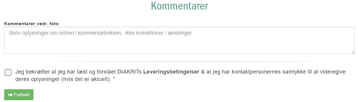 I kommentarfeltet kan du informere fotografen om specifikke ønsker eller oplysninger om boligen. Jo mere information, fotografen har at arbejde med, desto bedre. Informer fotografen om detaljer vedrørende nøgleafhentning, om I deltager i fotograferingen, eller hvis et bestemt rum ikke skal fotograferes. Du kan også angive særlige ønsker om vinkler og rum. Har I ingen specifikke ønsker, lades feltet blot stående tomt.