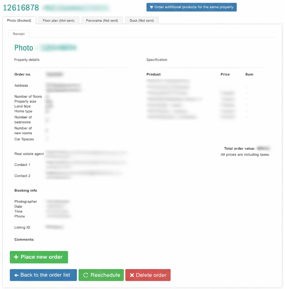 Example of the Order page. The Reschedule and Delete buttons are located at the bottom.